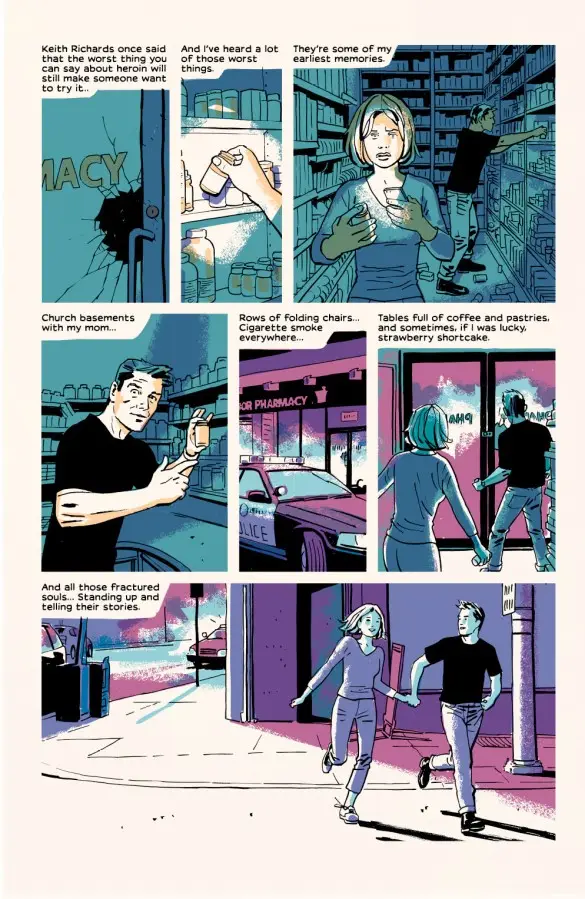 My Heroes Have Always Been Junkies is a tie-in to Phillips and Brubaker’s award-winning Criminal series. Criminal started way back in 2006 under Marvel’s Icon imprint and won the 2007 Eisner for “Best New Series”. The series jumped imprints to Image in 2014. Previous issues were republished under the Image brand. However, regardless of if you are familiar with their previous works, this is a wonderful stand-alone story that is a perfect place to jump on as Brubaker explained in a 2018 interview with CrimeReads: