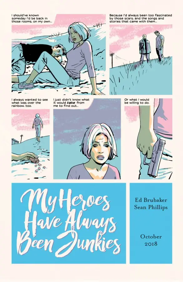 Artist Sean Phillips and writer Ed Brubaker are one of the strongest and most enduring collaborations in comics. They started working together in 2006 and have amassed an impressive twenty (22) Eisner nominations. They signed an exclusive contract with Image Comics ten years ago. Their contract expires in the next year so it will be interesting to see their plans as a team. Speaking of team, Sean brought his son (Jacob) on board with My Heroes Have Always Been Junkies to color this project. Jacob has since worked on some of their other projects and garnered his own notoriety with a 2022 Eisner nomination for “Best Colorist”. Sean spoke about the art direction for the book back in a 2018 interview with Tripwire: